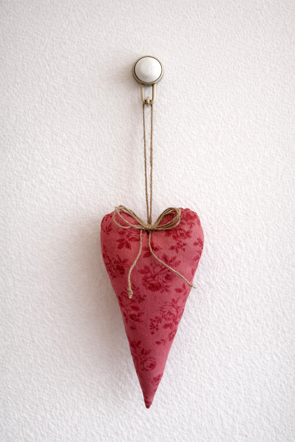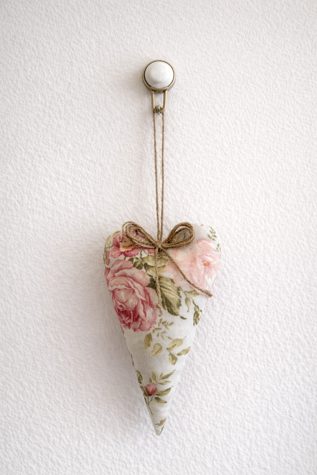 Confeccionado em tecido floral de algodão e finalizado com cordão em juta, este coração decorativo combina padrões suaves com materiais naturais, integrando-se facilmente em decorações de estilo rústico, shabby chic, romântico ou campestre.