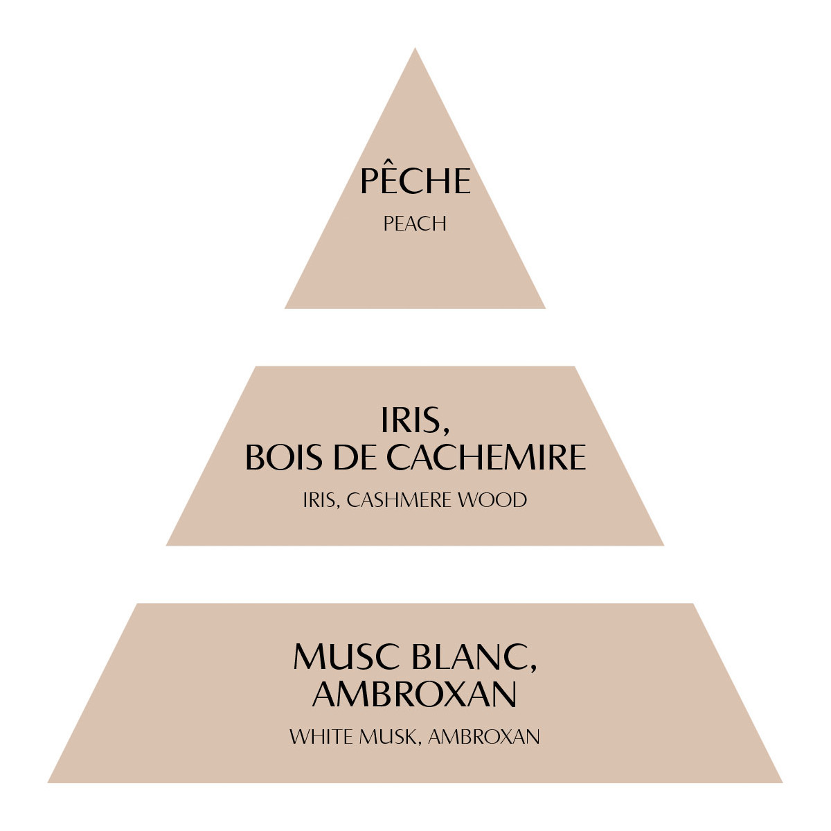 Deixe-se levar por Bois de Cachemire, uma fragrância com notas aveludadas de pêssego que se fundem com um coração floral de jasmim e íris. Os toques amadeirados da madeira de cashmere  envolvem-nos, finalizando com notas reconfortantes de almíscar branco.