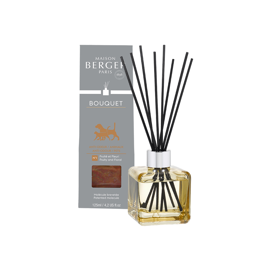 Este difusor perfumado único, neutraliza os maus cheiros dos nossos amigos de quatro patas graças à sua molécula patenteada. A sua bonita garrafa translúcida na cor champanhe é realçada pelo seu anel de prata e seus mikados pretos. A sua fórmula especial e o seu aroma frutado e floral reforçam a ação da molécula neutralizante.