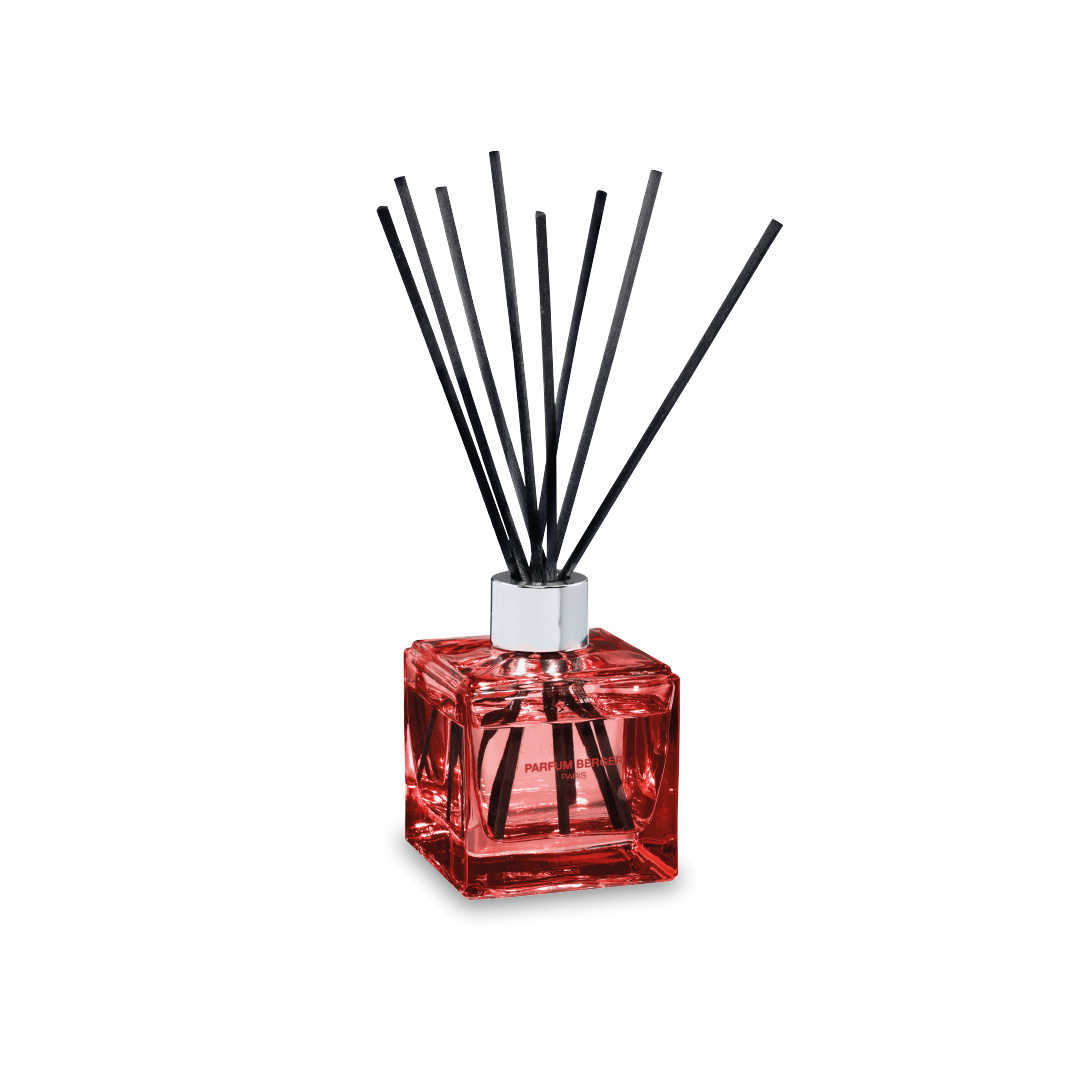 Difusor de fragrância em vidro vermelho com varetas pretas e embalagem cinza da Maison Berger Paris