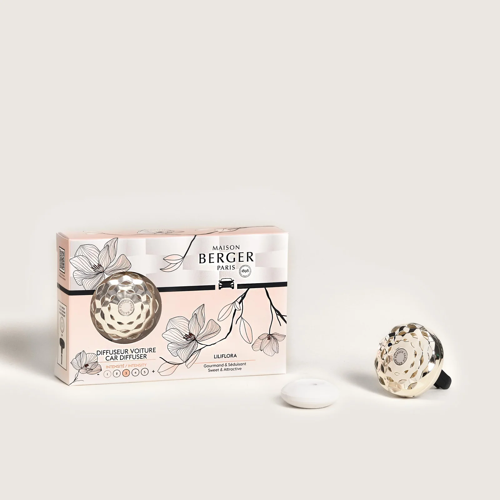 Este difusor fixa-se facilmente à grelha de ventilação, libertando o perfume Liliflora, uma fragrância floral e moderna. A recarga de cerâmica dura aproximadamente 4 semanas, envolvendo seu veículo com um perfume de otimismo e feminilidade.