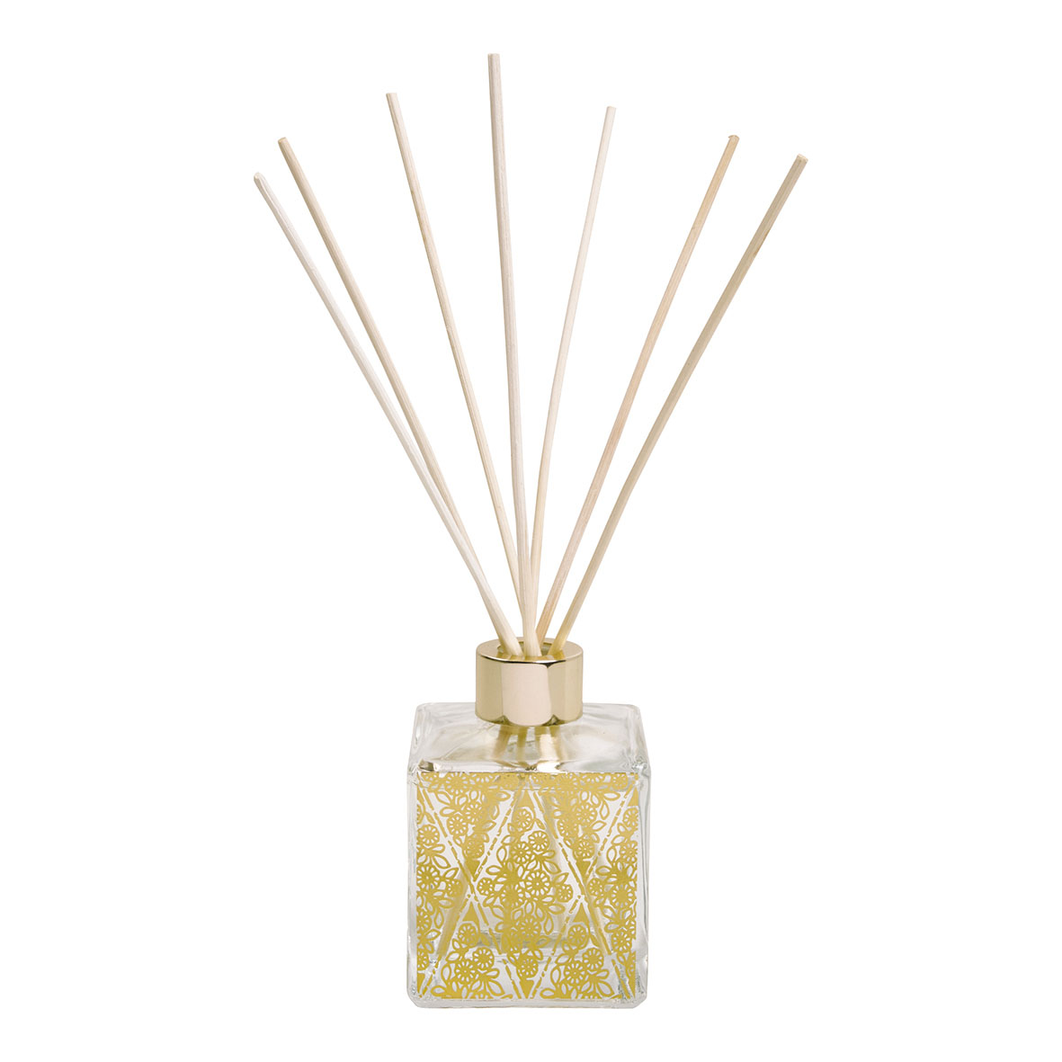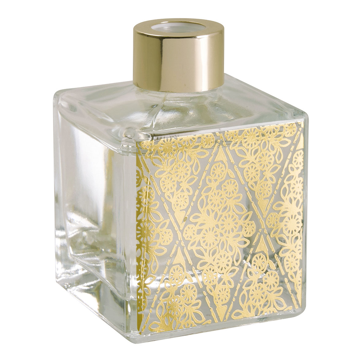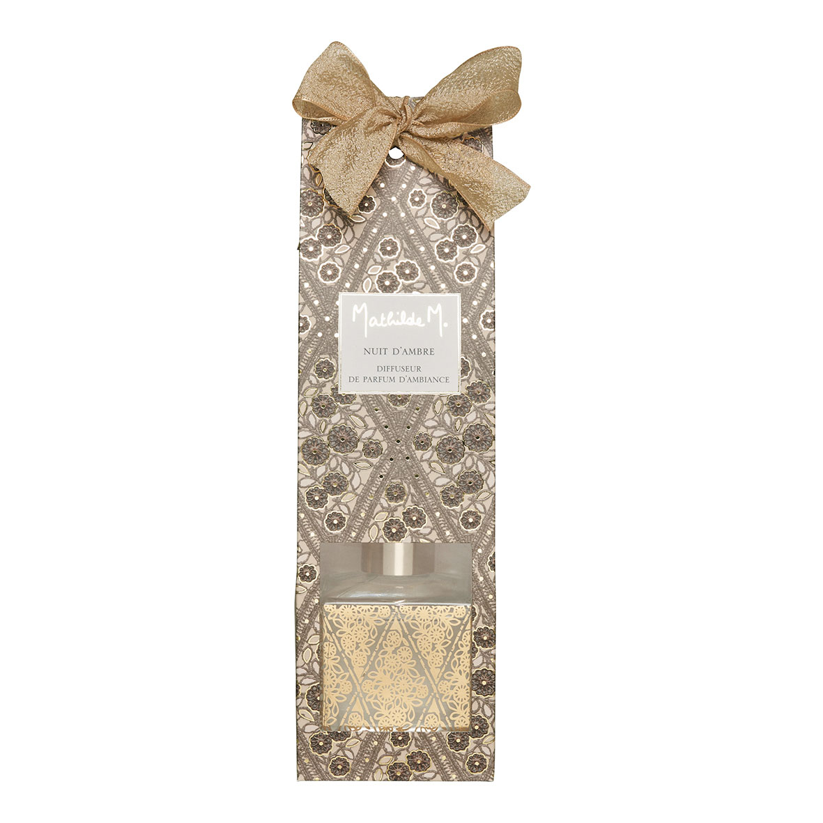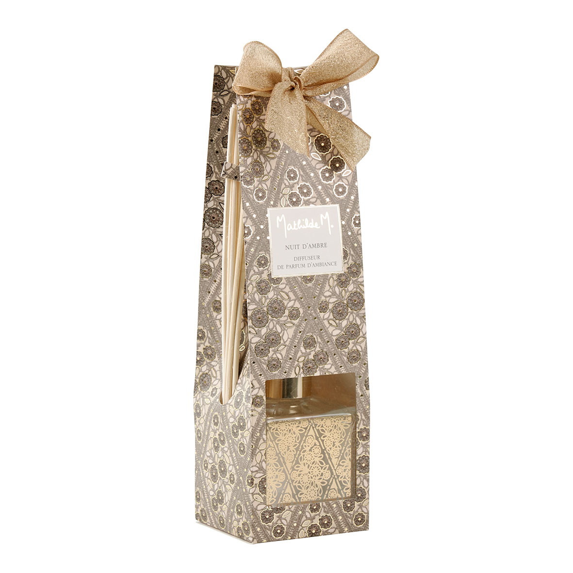Difusor de perfume de ambiente da coleção Fétes Enchantées Mathilde M, em frasco de vidro transparente com motivos decorativos em dourado.