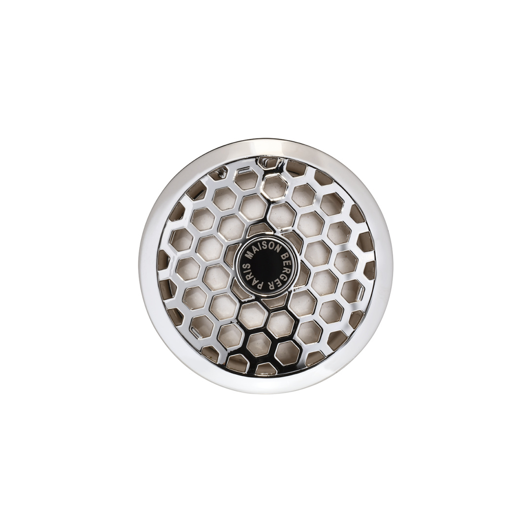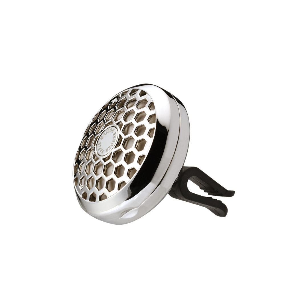Desenvolvido pela Maison Berger Paris, este moderno difusor com seu padrão de favo de mel e sua cor cromada será a companhia perfeita para as suas viagens! Este prático difusor para o seu carro tem um clipe de metal multidirecional para anexá-lo facilmente às saídas de ar e um núcleo cerâmico recarregável que permite uma difusão homogênea do perfume.
