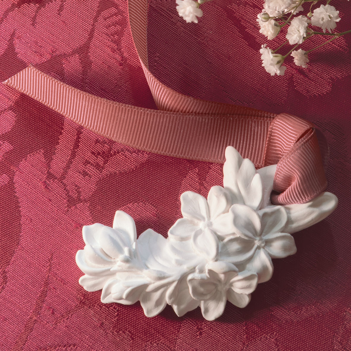 Totalmente feito à mão, este elemento decorativo em gesso representa um delicado ramo de cerejeira em flor. Perfuma suavemente e durante muito tempo pequenos espaços da sua casa, como armários, gavetas ou malas.