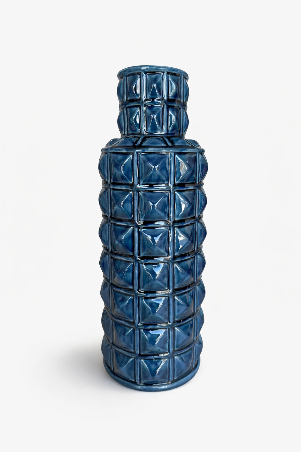 Jarrão decorativo em cerâmica num elegante tom azul-marinho brilhante, com padrão geométrico em relevo que cria textura e profundidade. Uma peça de forte presença decorativa, perfeita para consolas, aparadores ou mesas de apoio.