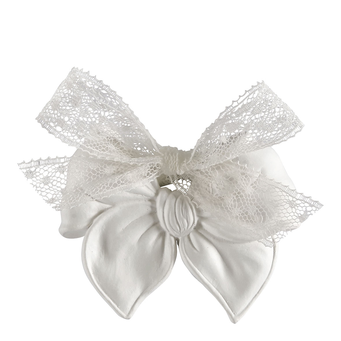 Laço decorativo branco com folhas em tecido e fita de renda
