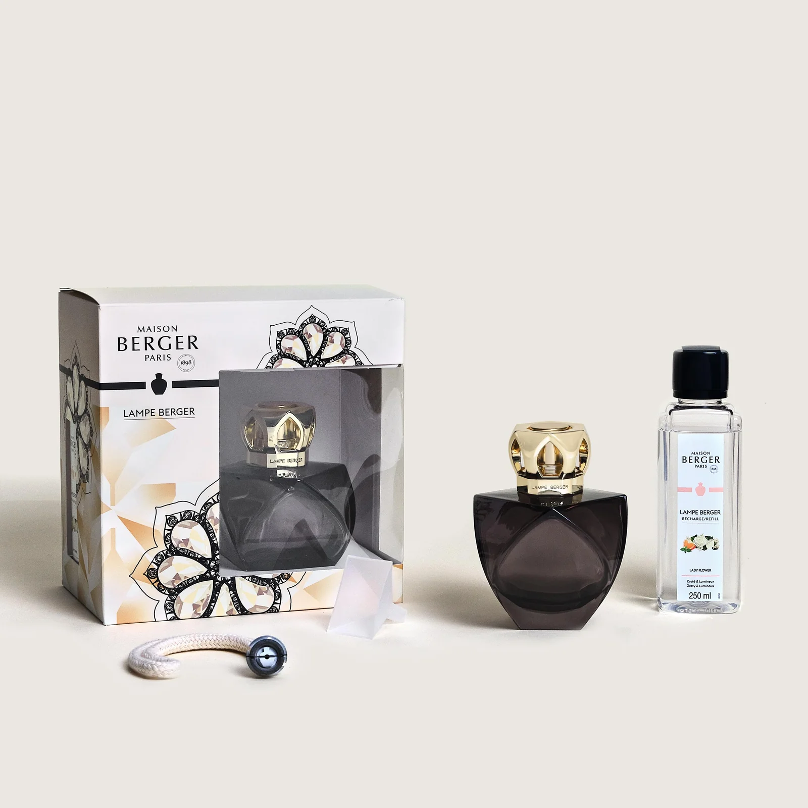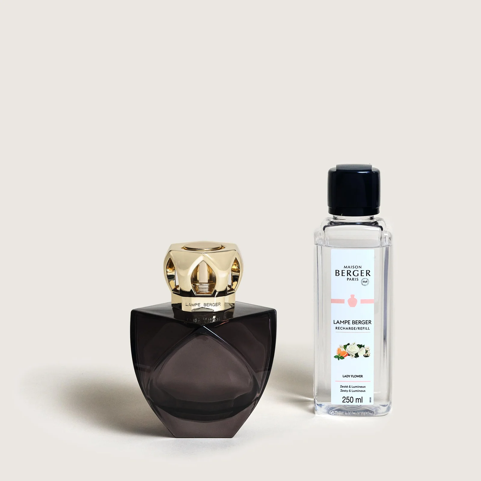 O coffret Lampe Berger Eternity Noire, criado por Sylvie De France, cativa com as suas linhas facetadas e design contemporâneo inspirado no luxo. O seu vidro fumado contrasta com sua moldura dourada vazada, trazendo um toque sofisticado e moderno à sua casa.