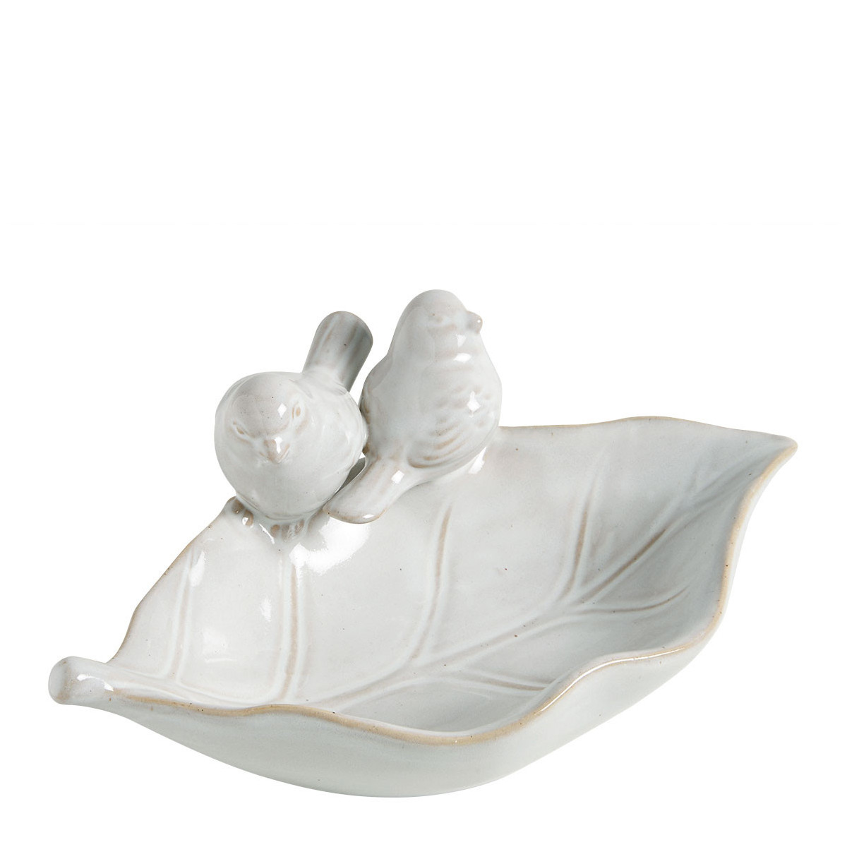 Prato decorativo em forma de folha com dois pássaros em cerâmica branca