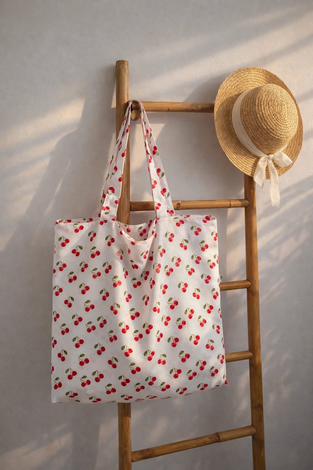 A Tote Bag Cherry Breeze é a escolha perfeita para os dias leves de verão. Com um padrão delicado de cerejas sobre fundo claro, transmite frescura, alegria e um toque retro irresistível.