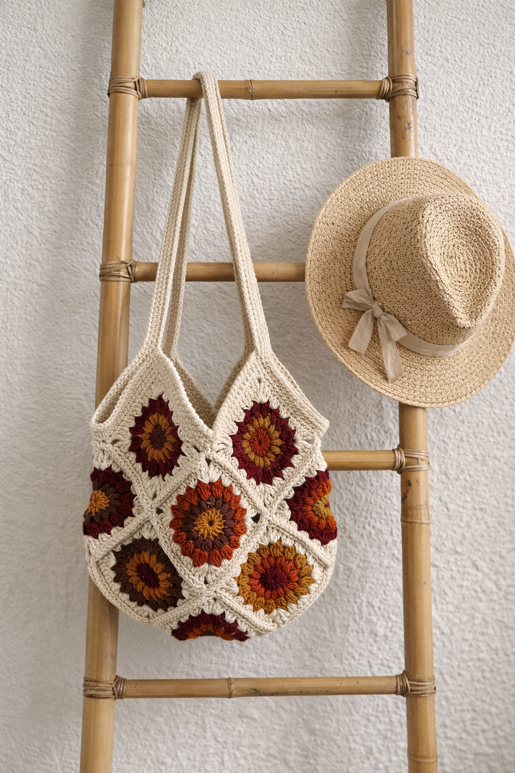 Tote bag em croché com granny squares, pensada para acompanhar dias leves e descontraídos.